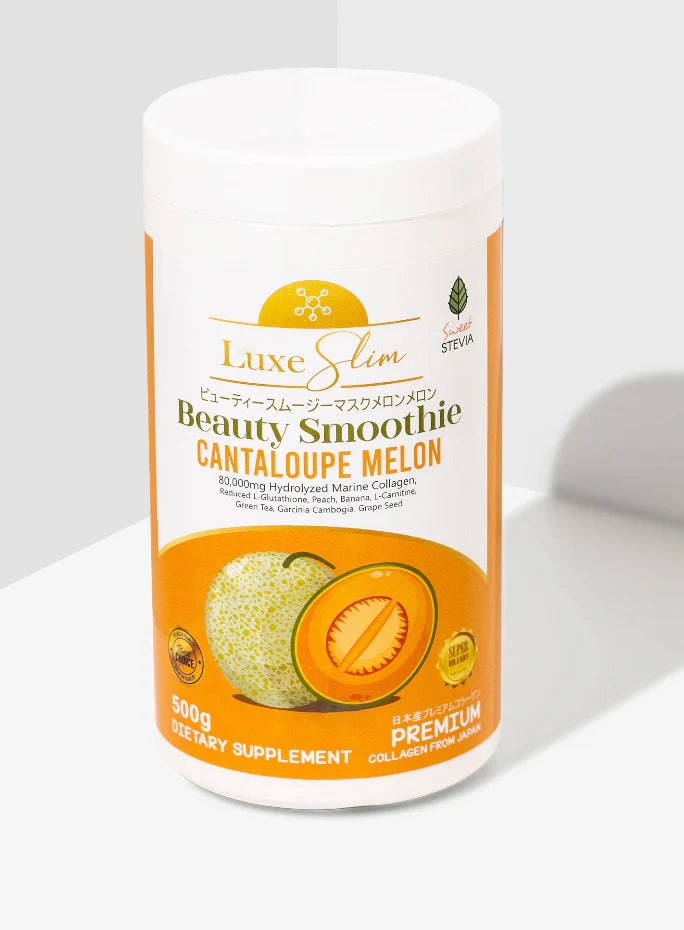 Formulated with premium Hydrolyzed Marine Collagen, Glutathione, Garcinia cambogia, and L-Carnitine, Luxe Slim Beauty Smoothie in Cantaloupe Melon flavor delivers dual benefits for skin and body. This advanced nutritional supplement combats free radical damage while promoting skin lightening and cellular regeneration. The carefully calibrated formula supports metabolic efficiency and collagen synthesis, resulting in improved skin elasticity and a more refined body composition.